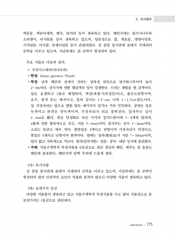 Ⅱ. 조사결과 www.nie.re.kr ? 275 맥문동, 맥문아제비, 해국, 털머위 등이 생육하고 있다. 해안가에는 돌가시나무와 소리쟁이, 낚시돌풀 등이 생육하고 있으며, 덩굴성으로 칡, 계요등, 댕댕이덩굴, 거지덩굴, 마삭줄, 담쟁이덩굴 등이 관찰되었다. 섬 중앙 동사면에 솜대가 식재되어 군락을 이루고 있으며, 서남쪽에는 칡 군락이 형성되어 있다. 주요 식물은 다음과 같다. ◇ 우묵사스레피 차나무과 ? 학명Eurya japonica Thunb. ? 특징남족 해안과 섬에서 자라는 상록성 관목으로 암수딴그루이며 높이 2∼3m이다. 잔가지에 연한 황갈색의 털이 밀생한다. 수피는 잿빛을 띤 갈색이다. 잎은 호생하고 2줄로 배열하며, 혁질 革質가죽질감 이고, 좁은도란형이며, 요두, 원저 또는 예저이고, 잎의 길이...