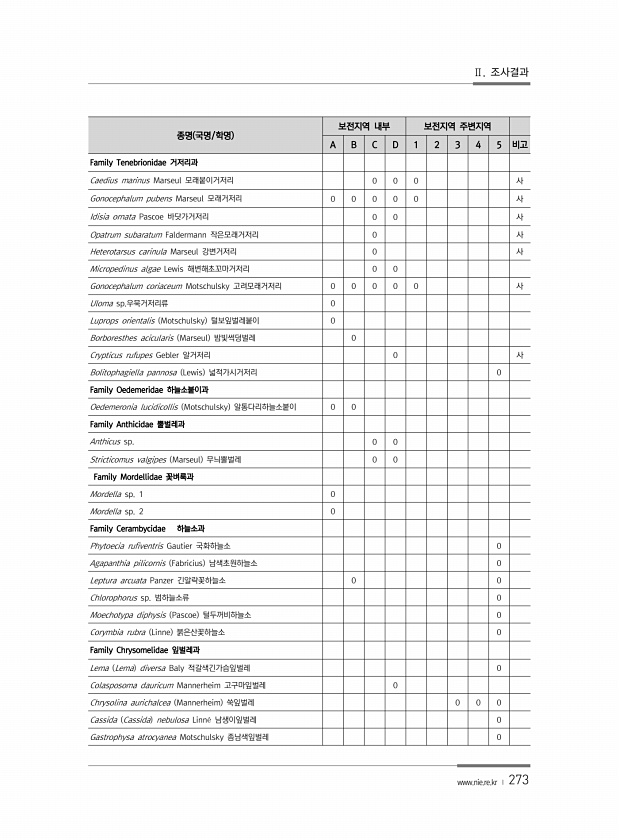 Ⅱ. 조사결과 www.nie.re.kr ? 273 종명 국명/학명 보전지역 내부 보전지역 주변지역 A B C D 1 2 3 4 5 비고 Family Tenebrionidae 거저리과 Caedius marinus Marseul 모래붙이거저리 0 0 0 사 Gonocephalum pubens Marseul 모래거저리 0 0 0 0 0 사 Idisia ornata Pascoe 바닷가거저리 0 0 사 Opatrum subaratum Faldermann 작은모래거저리 0 사 Heterotarsus carinula Marseul 강변거저리 0 사 Micropedinus algae Lewis 해변해초꼬마거저리 0 0 Gonocephalum coriaceum Motschulsky 고려모래거저리 0 0 0 0 0 사 Ulo...