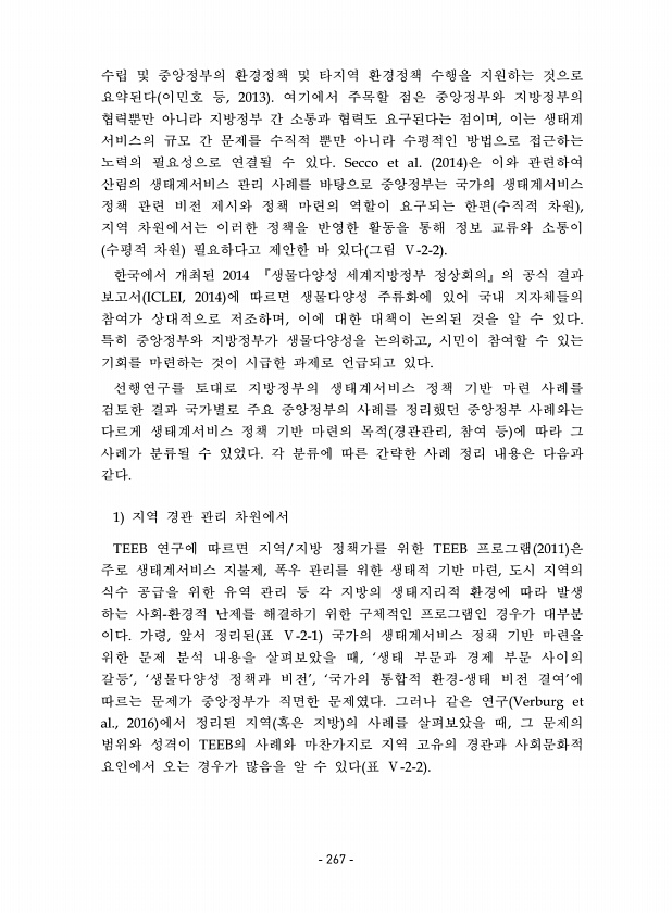 수립 및 중앙정부의 환경정책 및 타지역 환경정책 수행을 지원하는 것으로 요약된다 이민호 등, 2013 여기에서 주목할 점은 중앙정부와 지방정부의 협력뿐만 아니라 지방정부 간 소통과 협력도 요구된다는 점이며, 이는 생태계 서비스의 규모 간 문제를 수직적 뿐만 아니라 수평적인 방법으로 접근하는 노력의 필요성으로 연결될 수 있다. Secco et al. 2014 은 이와 관련하여 산림의 생태계서비스 관리 사례를 바탕으로 중앙정부는 국가의 생태계서비스 정책 관련 비전 제시와 정책 마련의 역할이 요구되는 한편 수직적 차원 , 지역 차원에서는 이러한 정책을 반영한 활동을 통해 정보 교류와 소통이 수평적 차원 필요하다고 제안한 바 있다 그림 Ⅴ-2-2 한국에서 개최된 2014 『생물다양성 세계지방정부 정상회의』 의 공식...