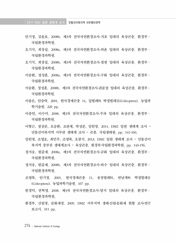 2017 DMZ 일원 생태계 조사 민통선이북지역 서부평야권역 274 ? National Institute of Ecology 안기정, 김윤호. 2008b. 제3차 전국자연환경조사-지포 일대의 육상곤충. 환경부· 국립환경과학원. 오기석, 최장섭. 2008a. 제3차 전국자연환경조사-외촌 일대의 육상곤충. 환경부· 국립환경과학원. 오기석, 최장섭. 2008b. 제3차 전국자연환경조사-철원 일대의 육상곤충. 환경부· 국립환경과학원. 이승환, 정성훈. 2008a. 제3차 전국자연환경조사-구화 일대의 육상곤충. 환경부· 국립환경과학원. 이승환, 정성훈. 2008b. 제3차 전국자연환경조사-판문점 일대의 육상곤충. 환경부· 국립환경과학원. 이종은, 안승락. 2001. 한국경제곤충 14, 잎벌레科 딱정벌레目 Coleop...