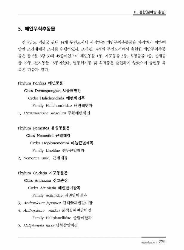 Ⅲ. 종합 분야별 총평 www.nie.re.kr ? 275 5. 해안무척추동물 전라남도 영광군 관내 14개 무인도서에 서식하는 해안무척추동물을 파악하기 위하여 암반 조간대에서 조사를 수행하였다. 조사된 14개의 무인도서에서 출현한 해안무척추동 물은 총 5문 8강 30과 49종이었으며 해면동물 1종, 자포동물 3종, 유형동물 1종, 연체동 물 29종, 절지동물 15종이었다. 멸종위기종 및 희귀종은 출현하지 않았으며 출현종 목 록은 다음과 같다. Phylum Porifera 해면동물 Class Demospongiae 보통해면강 Order Halichondrida 해변해면목 Family Halichondridae 해변해면과 1. Hymeniacidon sinapium 주황해변해면 Phylum Nemertea 유형...