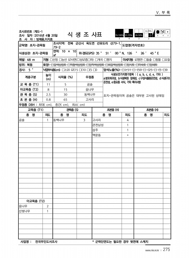 Ⅴ. 부 록 www.nie.re.kr ? 275 조사표번호 계도-1 조사 일자 2016년 4월 20일 조 사 자 방제용,이지효 식 생 조 사표 군락명초지-관목림 조사지역전북 군산시 옥도면 선유도리 산79-1, 79-2 도엽명 격자번호 식생상관초지-관목림 면적10 × 10 ㎡ 위·경도 GPS 35 ° 51 ′ 00 ″N, 126 ° 26 ′ 45 ″E 해발48 m 지형□산정 □능선 ?사면 ?상?중□하 □계곡 □평지 미세지형?평면 □돌출 □함몰 □요철 방위북동 토양□갈색삼림토 □적황색삼림토 □암적색삼림토 □회갈색삼림토 □침식토 □미숙토 □암쇄토 경사5 ° 낙엽부식층 cm □≥20 ? 15 □ 10 □ 5 □0 암석노출 % □≥51 □〈50 □〈25 □〈5 □0 계층구분 높이 m 식피율 % 우점종 식생보전가치평가...