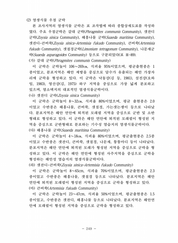 249 2 염생식물 우점 군락 본 조사지역의 염생식물 군락은 표 조작법에 따라 종합상재도표를 작성하 였다. 주요 우점군락은 갈대 군락 Phragmites communis Community , 갯잔디 군락 Zoysia sinica Community , 해홍나물 군락 Suaeda maritima Community , 갯잔디-큰비쑥 Zoysia sinica-Artemisia fukudo Community , 큰비쑥 Artemisia fukudo Community , 갯질경군락 Limonium tetragonum Community , 나문재군 락 Suaeda asparagoides Community 등으로 구분되었다 표 Ⅲ-89 가 갈대 군락 Phragmites communis Community 이 군락은 군락높이...