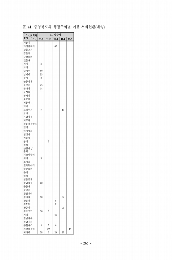 265 표 41. 충청북도의 행정구역별 어류 서식현황 계속 지역명 종명 11. 충주시 11-1 11-2 11-3 11-4 11-5 가물치 가시납지리 47 감돌고기 강준치 금강모치 긴몰개 꺽지 5 끄리 납자루 19 납지리 53 누치 3 눈동자개 돌고기 43 돌마자 14 동사리 동자개 둑중개 떡붕어 메기 모래무지 7 15 몰개 묵납자루 미꾸리 민물검정망둑 밀어 배가사리 뱀장어 버들치 붕어 2 1 빙어 산천어 송어 새코미꾸리 쉬리 5 쏘가리 얼룩동사리 연준모치 은어 잉어 점줄종개 줄납자루 20 줄몰개 중고기 참갈겨니 참마자 10 3 참몰개 6 참붕어 2 참종개 2 참중고기 30 3 치리 11 칼납자루 큰납지리 큰입배스 1 3 6 파랑볼우럭 29 15 피라미 78 3 2627