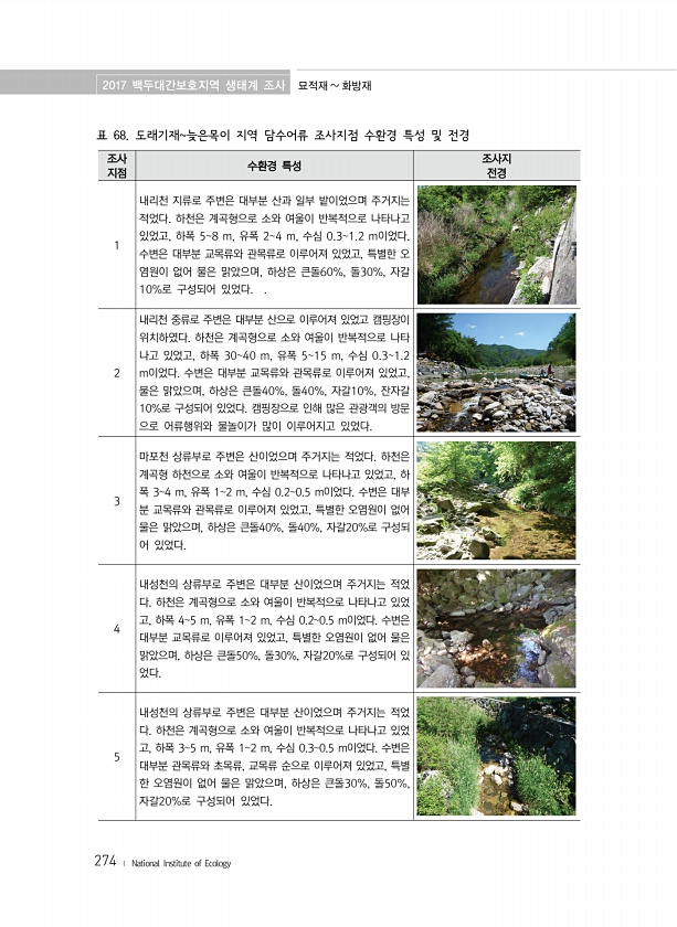 2017 백두대간보호지역 생태계 조사 묘적재 화방재 274 ? National Institute of Ecology 표 68. 도래기재늦은목이 지역 담수어류 조사지점 수환경 특성 및 전경 조사 지점 수환경 특성 조사지 전경 1 내리천 지류로 주변은 대부분 산과 일부 밭이었으며 주거지는 적었다. 하천은 계곡형으로 소와 여울이 반복적으로 나타나고 있었고, 하폭 58 m, 유폭 24 m, 수심 0.31.2 m이었다. 수변은 대부분 교목류와 관목류로 이루어져 있었고, 특별한 오 염원이 없어 물은 맑았으며, 하상은 큰돌60%, 돌30%, 자갈 10%로 구성되어 있었다. 2 내리천 중류로 주변은 대부분 산으로 이루어져 있었고 캠핑장이 위치하였다. 하천은 계곡형으로 소와 여울이 반복적으로 나타 나고 있었고, 하폭 304...