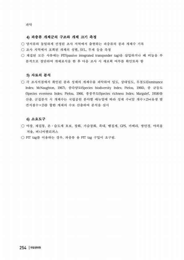 파악 파충류 개체군의 구조와 개체 크기 측정 ○ 양서류와 동일하게 선정된 조사 지역에서 출현하는 파충류의 종과 개체수 기록 ○ 조사 지역에서 포획된 개체의 성별, SVL, 무게 등을 측정 ○ 채집된 모든 사류에는 PIT passive integrated transponder tag 을 삽입하거나 배 비늘을 부 분적으로 절단하여 개체표식을 한 후 다음 조사 시 재포획 여부를 확인토록 함 자료의 분석 ○ 각 조사지점에서 확인된 종과 성체의 개체수를 파악하여 밀도, 상대밀도, 우점도 Dominance Index; McNaughton, 1967 , 종다양도 Species biodiversity Index; Pielou, 1966 , 종 균등도 Species evenness Index; Pielou, 1966, 종풍...