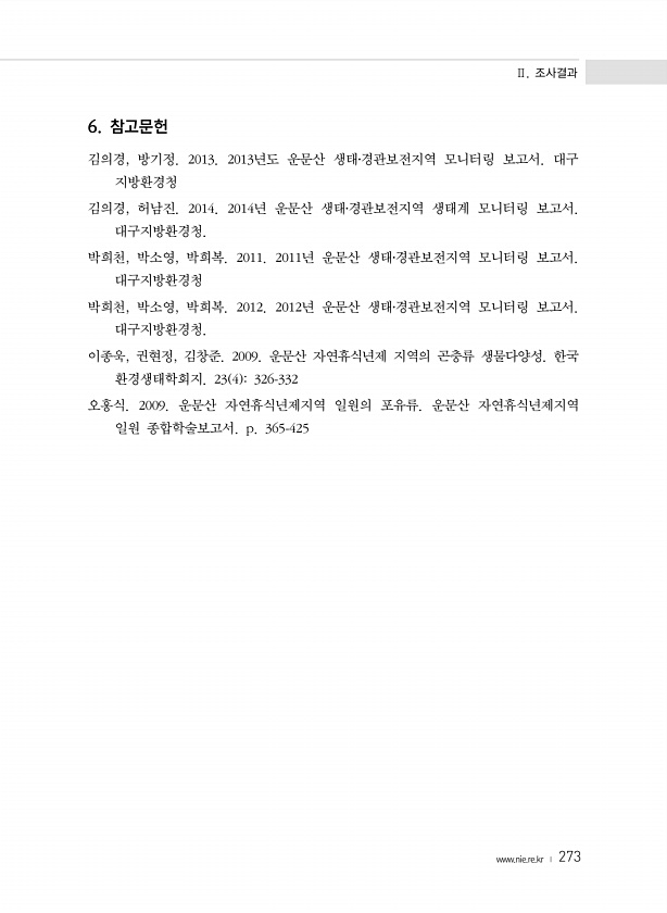 Ⅱ. 조사결과 www.nie.re.kr ? 273 6. 참고문헌 김의경, 방기정. 2013. 2013년도 운문산 생태?경관보전지역 모니터링 보고서. 대구 지방환경청 김의경, 허남진. 2014. 2014년 운문산 생태?경관보전지역 생태계 모니터링 보고서. 대구지방환경청. 박희천, 박소영, 박희복. 2011. 2011년 운문산 생태?경관보전지역 모니터링 보고서. 대구지방환경청 박희천, 박소영, 박희복. 2012. 2012년 운문산 생태?경관보전지역 모니터링 보고서. 대구지방환경청. 이종욱, 권현정, 김창준. 2009. 운문산 자연휴식년제 지역의 곤충류 생물다양성. 한국 환경생태학회지. 23 4 326-332 오홍식. 2009. 운문산 자연휴식년제지역 일원의 포유류. 운문산 자연휴식년제지역 일원 종합학술보고서. ...