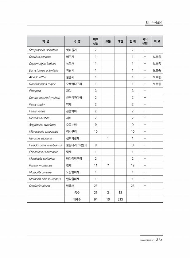 III. 조사결과 www.nie.re.kr ?273 학 명 국 명 배후 산림 초본 해빈 합 계 서식 유형 비 고 Streptopelia orientalis 멧비둘기 7 7 Cuculus canorus 뻐꾸기 1 1 보호종 Caprimulgus indicus 쏙독새 1 1 보호종 Eurystomus orientalis 파랑새 1 1 보호종 Alcedo atthis 물총새 1 1 보호종 Dendrocopos major 오색딱다구리 1 1 보호종 Pica pica 까치 3 3 Corvus macrorhynchos 큰부리까마귀 2 2 Parus major 박새 2 2 Parus varius 곤줄박이 2 2 Hirundo rustica 제비 2 2 Aegithalos caudatus 오목눈이 9 9 Microsce...