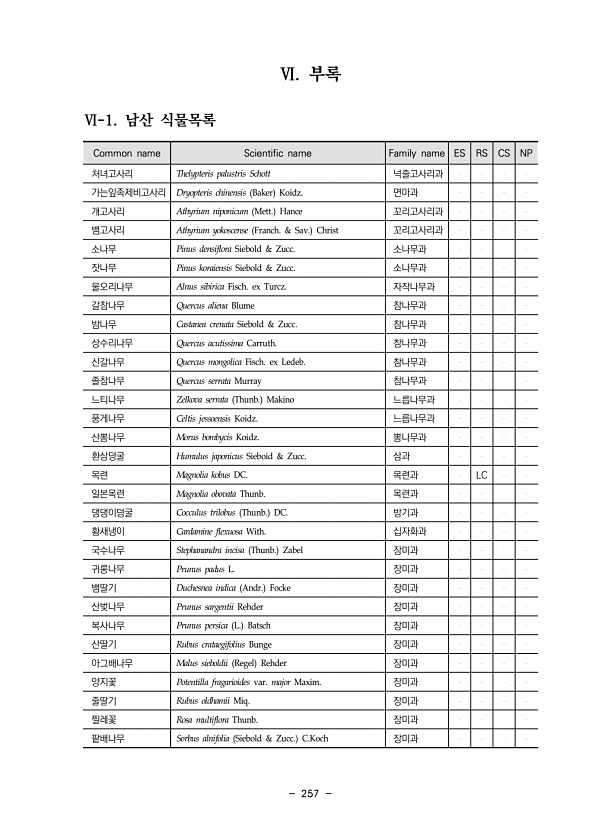 257 Ⅵ. 부록 Ⅵ-1. 남산 식물목록 Common name Scientific name Family name ES RS CS NP 처녀고사리 Thelypteris palustris Schott 넉줄고사리과 가는잎족제비고사리 Dryopteris chinensis Baker Koidz. 면마과 개고사리 Athyrium niponicum Mett. Hance 꼬리고사리과 뱀고사리 Athyrium yokoscense Franch. & Sav. Christ 꼬리고사리과 소나무 Pinus densiflora Siebold & Zucc. 소나무과 잣나무 Pinus koraiensis Siebold & Zucc. 소나무과 물오리나무 Alnus sibirica Fisch. ex Turcz. 자작나무과 갈참나무 Querc...