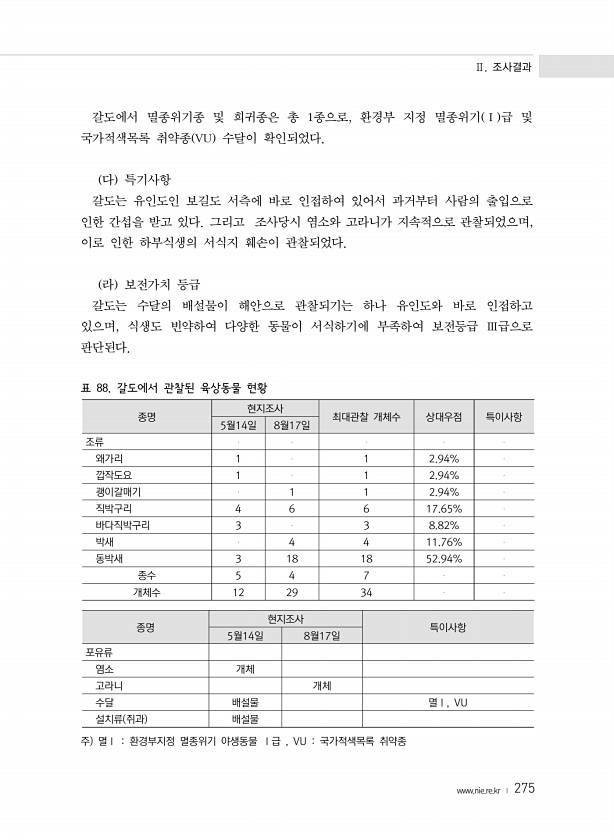 Ⅱ. 조사결과 www.nie.re.kr ? 275 갈도에서 멸종위기종 및 희귀종은 총 1종으로, 환경부 지정 멸종위기 Ⅰ 급 및 국가적색목록 취약종 VU 수달이 확인되었다. 다 특기사항 갈도는 유인도인 보길도 서측에 바로 인접하여 있어서 과거부터 사람의 출입으로 인한 간섭을 받고 있다. 그리고 조사당시 염소와 고라니가 지속적으로 관찰되었으며, 이로 인한 하부식생의 서식지 훼손이 관찰되었다. 라 보전가치 등급 갈도는 수달의 배설물이 해안으로 관찰되기는 하나 유인도와 바로 인접하고 있으며, 식생도 빈약하여 다양한 동물이 서식하기에 부족하여 보전등급 Ⅲ급으로 판단된다. 표 88. 갈도에서 관찰된 육상동물 현황 종명 현지조사 최대관찰 개체수 상대우점 특이사항 5월14일 8월17일 조류 왜가리 1 ...