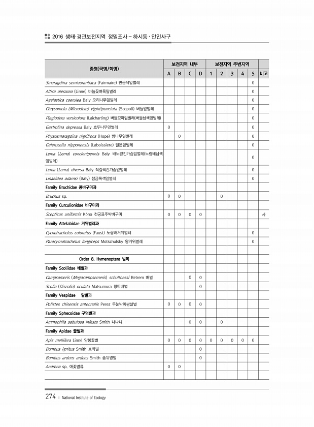 2016 생태·경관보전지역 정밀조사 하시동 · 안인사구 274 ? National Institute of Ecology 종명 국명/학명 보전지역 내부 보전지역 주변지역 A B C D 1 2 3 4 5 비고 Smaragdina semiaurantiaca Fairmaire 반금색잎벌레 0 Altica oleracea Linn? 바늘꽃벼룩잎벌레 0 Agelastica coerulea Baly 오리나무잎벌레 0 Chrysomela Microdera vigintipunctata Scopoli 버들잎벌레 0 Plagiodera versicolora Laicharting 버들꼬마잎벌레 버들남색잎벌레 0 Gastrolina depressa Baly 호두나무잎벌레 0 0 Physosmaragdina nigrifrons Ho...