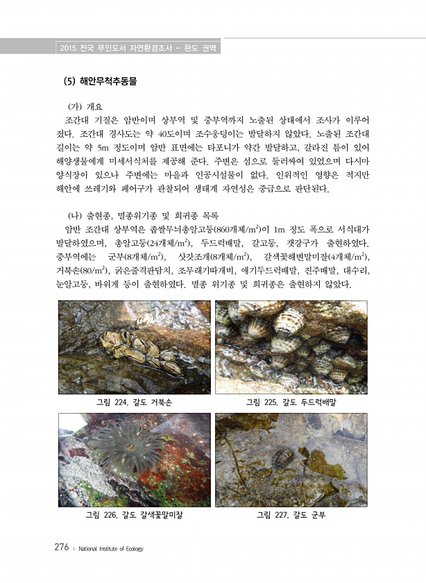 2015 전국 무인도서 자연환경조사 완도 권역 276 ? National Institute of Ecology 5 해안무척추동물 가 개요 조간대 기질은 암반이며 상부역 및 중부역까지 노출된 상태에서 조사가 이루어 졌다. 조간대 경사도는 약 40도이며 조수웅덩이는 발달하지 않았다. 노출된 조간대 길이는 약 5m 정도이며 암반 표면에는 타포니가 약간 발달하고, 갈라진 틈이 있어 해양생물에게 미세서식처를 제공해 준다. 주변은 섬으로 둘러싸여 있었으며 다시마 양식장이 있으나 주변에는 마을과 인공시설물이 없다. 인위적인 영향은 적지만 해안에 쓰레기와 페어구가 관찰되어 생태계 자연성은 중급으로 판단된다. 나 출현종, 멸종위기종 및 희귀종 목록 암반 조간대 상부역은 좁쌀무늬총알고둥 860개체/m2 이 1m 정도 폭으로 ...