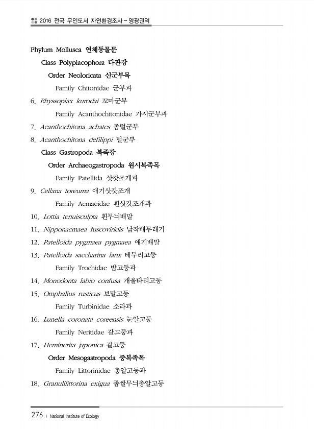 2016 전국 무인도서 자연환경조사 영광권역 276 ? National Institute of Ecology Phylum Mollusca 연체동물문 Class Polyplacophora 다판강 Order Neoloricata 신군부목 Family Chitonidae 군부과 6. Rhyssoplax kurodai 꼬마군부 Family Acanthochitonidae 가시군부과 7. Acanthochitona achates 좀털군부 8. Acanthochitona defilippi 털군부 Class Gastropoda 복족강 Order Archaeogastropoda 원시복족목 Family Patellida 삿갓조개과 9. Cellana toreuma 애기삿갓조개 Family Acmaeidae 흰삿갓조개과 10...