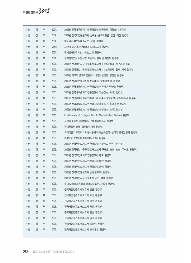 ? 환 경 부 2004. 2003년 전국내륙습지 자연환경조사해평습지 · 검암습지. 환경부. ? 환 경 부 2004. 2004년 전국자연동굴조사심복굴 · 송학박쥐굴 · 금산 · 괴산. 환경부. ? 환 경 부 2004. 백두대간 훼손실태조사 연구 Ⅱ 환경부 ? 환 경 부 2004. 새만금 하구역 자연생태계 조사보고서. 환경부. ? 환 경 부 2004. 장기생태연구 시범사업 보고서. 환경부. ? 환 경 부 2004. 장기생태연구 시범사업표준조사 항목 및 지침서. 환경부. ? 환 경 부 2005. 2004년 전국해안사구 정밀조사 보고서 Ⅰ 명사십리 · 사구미. 환경부. ? 환 경 부 2005. 2004년 전국해안사구 정밀조사 보고서 Ⅱ 섭지코지 · 협재 · 사계. 환경부. ? 환 경 부 2005. 2004년 하구역...