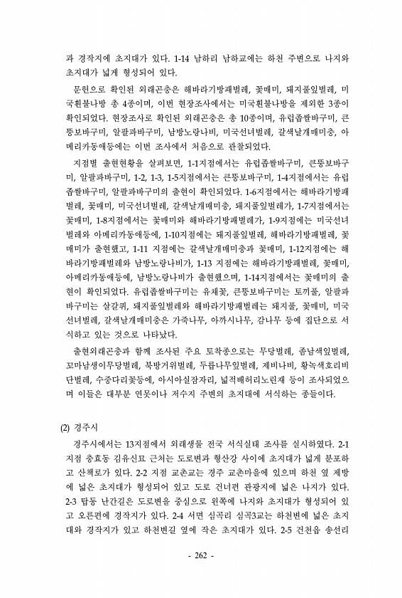 260 국명 학명 ‘15년 조사종 문헌 확인종 원추천인국 Rudbeckia bicolor Nutt. ○ ○ 유럽개미자리 Spergularia rubra J.Presl & C.Presl ○ ○ 유럽나도냉이 Barbarea vulgaris R.Br. ○ 유럽미나리아재비 Ranunculus muricatus L. ○ 유럽장대 Sisymbrium officinale L. Scop. ○ ○ 유럽전호 Anthriscus caucalis M.Bieb. ○ 유럽점나도나물 Cerastium glomeratum Thuill. ○ ○ 유럽쥐손이 Erodium moschatum LHer. ○ 유채 Brassica napus L. ○ 유홍초 Quamoclit pennata Desr. Bojer ○ 은털새 Aira caryophyl...