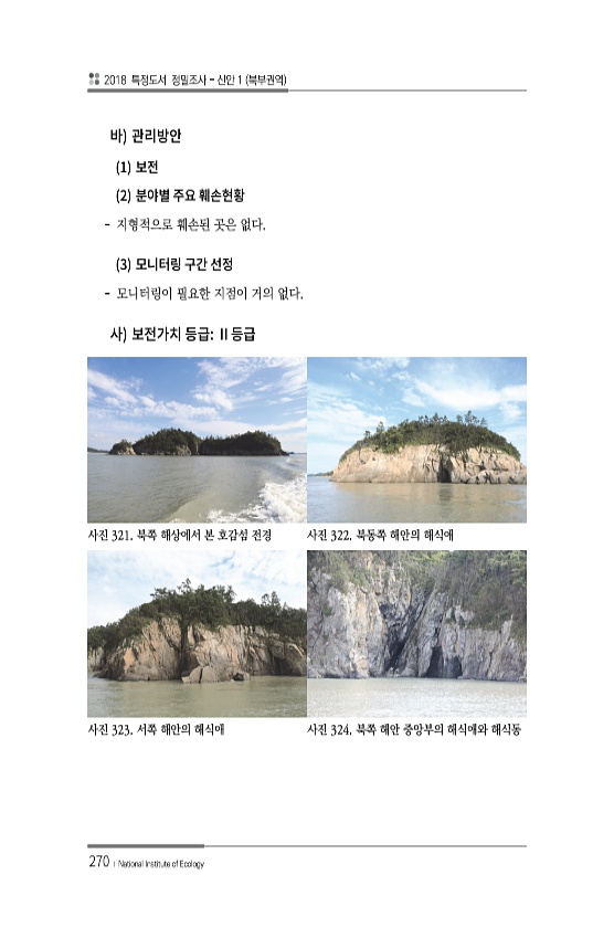 2018 특정도서 정밀조사 신안 1 북부권역 270 ? National Institute of Ecology 1 2 지형적으로 훼손된 곳은 없다. 3 모니터링이 필요한 지점이 거의 없다. 사진 321. 북쪽 해상에서 본 호감섬 전경 사진 322. 북동쪽 해안의 해식애 사진 323. 서쪽 해안의 해식애 사진 324. 북쪽 해안 중앙부의 해식애와해식동