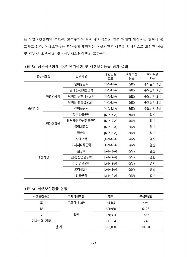 274 은 담양하천습지내 수변부, 고수부지와 같이 주기적으로 침수 피해가 발생하는 입지에 분 포하고 있다. 식생보전등급 Ⅴ등급에 해당되는 식생자원은 대부분 일시적으로 조성된 식생 및 다년생 초본식생, 일·이년생초본식생을 포함한다. 상관식생형 단위식생 등급판정 코드 식생보전 등급 국가식생 자원 습지식생 하변연목림 왕버들군락 [N-N-M-A] 5 Ⅲ 주요감시 2급 왕버들-선버들군락 [N-N-M-A] 5 Ⅲ 주요감시 2급 왕버들-달뿌리풀군락 [N-N-M-A] 5 Ⅲ 주요감시 2급 왕버들-환삼덩굴군락 [N-N-M-A] 5 Ⅲ 주요감시 2급 선버들군락 [N-N-M-A] 5 Ⅲ 주요감시 2급 연안대식생 달뿌리풀군락 [N-N-S-A] 3 Ⅳ 일반 달뿌리풀-환삼덩굴군락 [N-N-S-A] 3 Ⅳ 일반 물억새군락 [N-N-S...