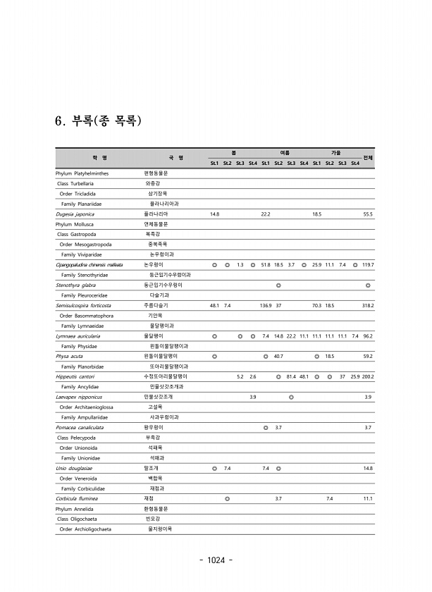 1024 6. 부록 종 목록 학 명 국 명 봄 여름 가을 전체 St.1 St.2 St.3 St.4 St.1 St.2 St.3 St.4 St.1 St.2 St.3 St.4 Phylum Platyhelminthes 편형동물문 Class Turbellaria 와충강 Order Tricladida 삼기장목 Family Planariidae 플라나리아과 Dugesia japonica 플라나리아 14.8 22.2 18.5 55.5 Phylum Mollusca 연체동물문 Class Gastropoda 복족강 Order Mesogastropoda 중복족목 Family Viviparidae 논우렁이과 Cipangopaludina chinensis malleata 논우렁이 ◎ ◎ 1.3 ◎ 51.8 18.5 3.7 ◎ 25....