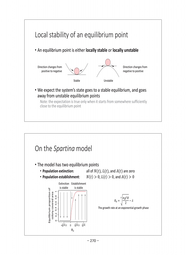 On the Spartina model ? The model has two equilibrium points ? Population extinctionall of 푁 푡 , 퐿 푡 , and 퐴 푡 are zero ? Population establishment푁 푡 0, 퐿 푡 0, and 퐴 푡 0 Extinction is stable Establishment is stable 푅0 = 3 휋푔2푅 2 ? 휆 The growth rate at an exponential-growth phase Equilibrium proportion of colony covered area Local stability of an equilibrium point ? An equilibrium point is either l...