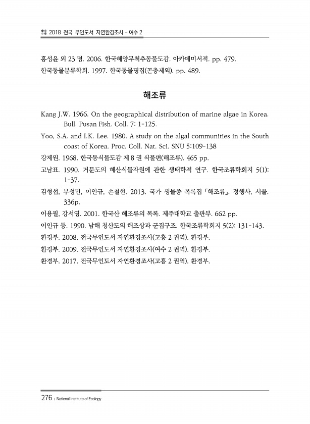 2018 전국 무인도서 자연환경조사 여수 2 276 ? National Institute of Ecology 홍성윤 외 23 명. 2006. 한국해양무척추동물도감. 아카데미서적. pp. 479. 한국동물분류학회. 1997. 한국동물명집 곤충제외 pp. 489. Kang J.W. 1966. On the geographical distribution of marine algae in Korea. Bull. Pusan Fish. Coll. 71-125. Yoo, S.A. and I.K. Lee. 1980. A study on the algal communities in the South coast of Korea. Proc. Coll. Nat. Sci. SNU 5109-138 강제원. 1968. 한국동식물도감 제...