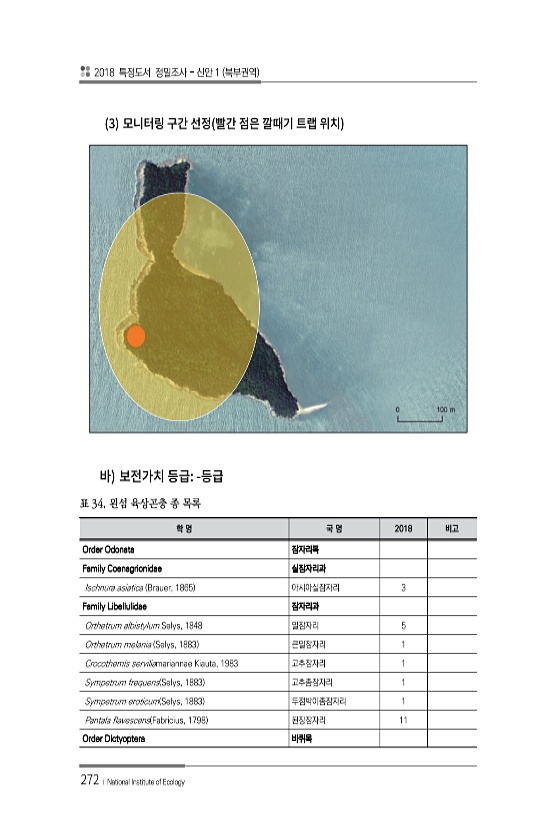 2018 특정도서 정밀조사 신안 1 북부권역 272 ? National Institute of Ecology 3 학 명 국 명 2018 비고 Order Odonata 잠자리목 Family Coenagrionidae 실잠자리과 Ischnura asiatica Brauer, 1865 아시아실잠자리 3 Family Libellulidae 잠자리과 Orthetrum albistylum Selys, 1848 밀잠자리 5 Orthetrum melania Selys, 1883 큰밀잠자리 1 Crocothemis serviliamariannae Kiauta, 1983 고추잠자리 1 Sympetrum frequens Selys, 1883 고추좀잠자리 1 Sympetrum eroticum Selys, 1883 두점박이좀잠자리...