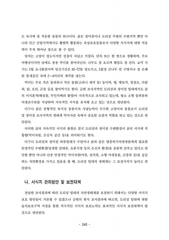 260 도 육식에 잘 적응한 동물의 하나이다 삵은 청미천이나 도리섬 주변의 수변지역 뿐만 아 니라 인근 산림지역에서도 활발히 활동하는 육상포유동물로서 다양한 서식지에 대한 적응 력이 무척 뛰어난 종으로 볼 수 있다. 덩치는 고양이 정도이지만 성질이 사납고 거칠다 단독 또는 한 쌍으로 생활하며 주로 , 야행성이지만 낮에도 종종 먹이를 찾아다닌다 나무도 잘 오르며 헤엄도 잘 친다 교미 시 기는 월 초 월말이며 임신기간은 일 정도이고 월경 큰나무 빈 구멍이나 잘 은폐 2 3 6572 , 5 된 틈새공간 속에 마리의 새끼를 낳는다 2 4 ∼ 먹이는 주로 작은 들쥐류나 작은 동물 고라니 새끼 등 등이며 꿩 멧토끼 청설모 다람 , , , , 쥐 닭 오리 곤충 등을 잡아먹기도 한다 금번 조사지역인 도리섬과 청미천 일대에...
