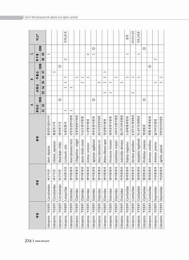 2016 백두대간보호지역 생태계 조사 밀재묘적재 274Ⅰwww.nie.re.kr 목명 과명 종명 A B C 희양산 비고* 2008 조령산 주흘산 2008 투구봉 2008 S1 S2 S3 S4 S5 S6 S7 S8 S9 Coleoptera 딱정벌레목 Curculionidae 바구미과 Baris dispilota 흰점박이꽃바구미 1 Coleoptera 딱정벌레목 Curculionidae 바구미과 Cleonus japonicus 흰줄바구미 1 Coleoptera 딱정벌레목 Curculionidae 바구미과 Mesalcidodes trifidus 배자바구미 ◎ ◎ Coleoptera 딱정벌레목 Lampyridae 반딧불이과 Lychnuris rufa 늦반딧불이 1 1 1 1 2 국외,천적 Coleoptera 딱정벌...