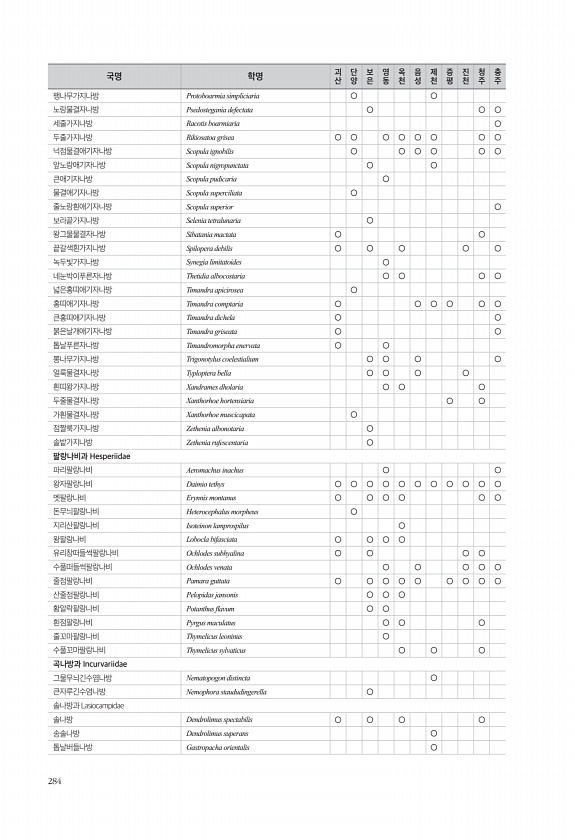 284 팽나무가지나방 Protoboarmia simpliciaria ○ ○ 노랑물결자나방 Psedostegania defectata ○ ○ ○ 세줄가지나방 Racotis boarmiaria ○ 두줄가지나방 Rikiosatoa grisea ○ ○ ○ ○ ○ ○ ○ ○ 넉점물결애기자나방 Scopula ignobilis ○ ○ ○ ○ ○ ○ 앞노랑애기자나방 Scopula nigropunctata ○ ○ 큰애기자나방 Scopula pudicaria ○ 물결애기자나방 Scopula superciliata ○ 줄노랑흰애기자나방 Scopula superior ○ 보라끝가지나방 Selenia tetralunaria ○ 왕그물물결자나방 Sibatania mactata ○ ○ 끝갈색흰가지나방 Spilopera debilis ...