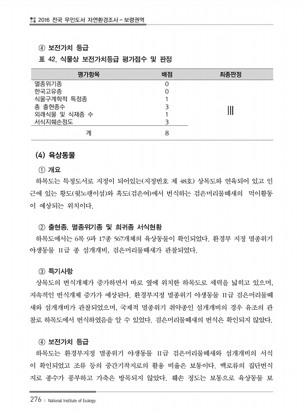 2016 전국 무인도서 자연환경조사 보령권역 276 ? National Institute of Ecology ④ 보전가치 등급 표 42. 식물상 보전가치등급 평가점수 및 판정 평가항목 배점 최종판정 멸종위기종 0 Ⅲ 한국고유종 0 식물구계학적 특정종 1 총 출현종수 3 외래식물 및 식재종 수 1 서식지훼손정도 3 계 8 4 육상동물 ① 개요 하목도는 특정도서로 지정이 되어있는 지정번호 제 48호 상목도와 연육되어 있고 인 근에 있는 황도 윗노랭이섬 와 흑도 검은여 에서 번식하는 검은머리물떼새의 먹이활동 이 예상되는 위치이다. ② 출현종, 멸종위기종 및 희귀종 서식현황 하목도에서는 6목 9과 17종 567개체의 육상동물이 확인되었다. 환경부 지정 멸종위기 야생동물 Ⅱ급 종 섬개개비, 검은머리물떼새가 관찰되었다...