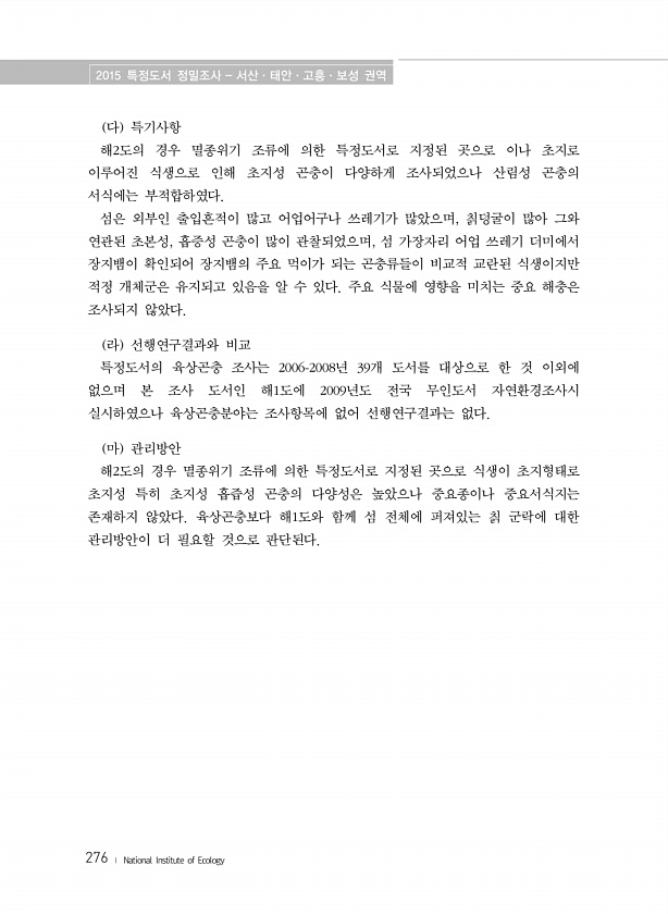 2015 특정도서 정밀조사 서산·태안·고흥·보성 권역 276 ? National Institute of Ecology 다 특기사항 해2도의 경우 멸종위기 조류에 의한 특정도서로 지정된 곳으로 이나 초지로 이루어진 식생으로 인해 초지성 곤충이 다양하게 조사되었으나 산림성 곤충의 서식에는 부적합하였다. 섬은 외부인 출입흔적이 많고 어업어구나 쓰레기가 많았으며, 칡덩굴이 많아 그와 연관된 초본성, 흡증성 곤충이 많이 관찰되었으며, 섬 가장자리 어업 쓰레기 더미에서 장지뱀이 확인되어 장지뱀의 주요 먹이가 되는 곤충류들이 비교적 교란된 식생이지만 적정 개체군은 유지되고 있음을 알 수 있다. 주요 식물에 영향을 미치는 중요 해충은 조사되지 않았다. 라 선행연구결과와 비교 특정도서의 육상곤충 조사는 2006-2008년 ...