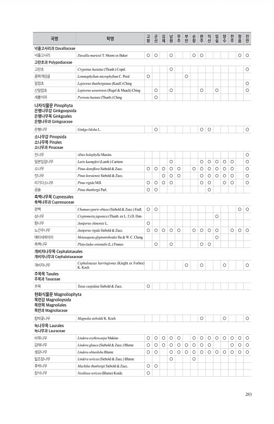 283 넉줄고사리과 Davalliaceae 넉줄고사리 Davallia mariesii T. Moore ex Baker ○ ○ ○ ○ ○ ○ ○ 고란초과 Polypodiaceae 고란초 Crypsinus hastatus Thunb. Copel. ○ ○ 콩짜개덩굴 Lemmaphyllum microphyllum C. Presl ○ ○ 일엽초 Lepisorus thunbergianus Kaulf. Ching ○ 산일엽초 Lepisorus ussuriensis Regel & Maack Ching ○ ○ ○ ○ ○ 세뿔석위 Pyrrosia hastata Thunb. Ching ○ 나자식물문 Pinophyta 은행나무강 Ginkgoopsida 은행나무목 Ginkgoales 은행나무과 Ginkgoaceae 은행나무 Gin...