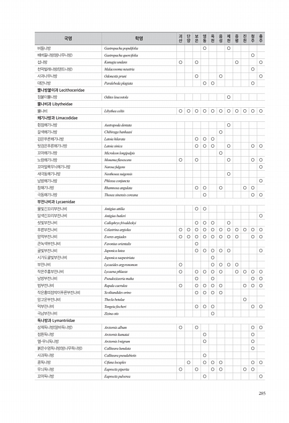 285 버들나방 Gastropacha populifolia ○ ○ 배버들나방 밤나무나방 Gastropacha quercifolia ○ 섭나방 Kunugia undans ○ ○ ○ ○ 천막벌레나방 텐트나방 Malacosoma neustria ○ 사과나무나방 Odonestis pruni ○ ○ ○ 대만나방 Paralebeda plagiata ○ ○ ○ 뿔나방붙이과 Lecithoceridae 점붙이뿔나방 Odites leucostola ○ 뿔나비과 Libytheidae 뿔나비 Libythea celtis ○ ○ ○ ○ ○ ○ ○ ○ ○ ○ ○ 쐐기나방과 Limacodidae 흰점쐐기나방 Austrapoda dentata ○ 갈색쐐기나방 Chibiraga banhaasi ○ 검은푸른쐐기나방 Latoia hilara...