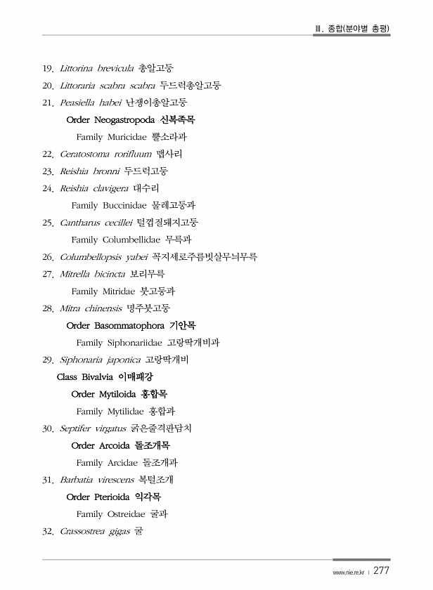 Ⅲ. 종합 분야별 총평 www.nie.re.kr ? 277 19. Littorina brevicula 총알고둥 20. Littoraria scabra scabra 두드럭총알고둥 21. Peasiella habei 난쟁이총알고둥 Order Neogastropoda 신복족목 Family Muricidae 뿔소라과 22. Ceratostoma rorifluum 맵사리 23. Reishia bronni 두드럭고둥 24. Reishia clavigera 대수리 Family Buccinidae 물레고둥과 25. Cantharus cecillei 털껍질돼지고둥 Family Columbellidae 무륵과 26. Columbellopsis yabei 꼭지세로주름빗살무늬무륵 27. Mitrella bicincta 보리무륵 ...