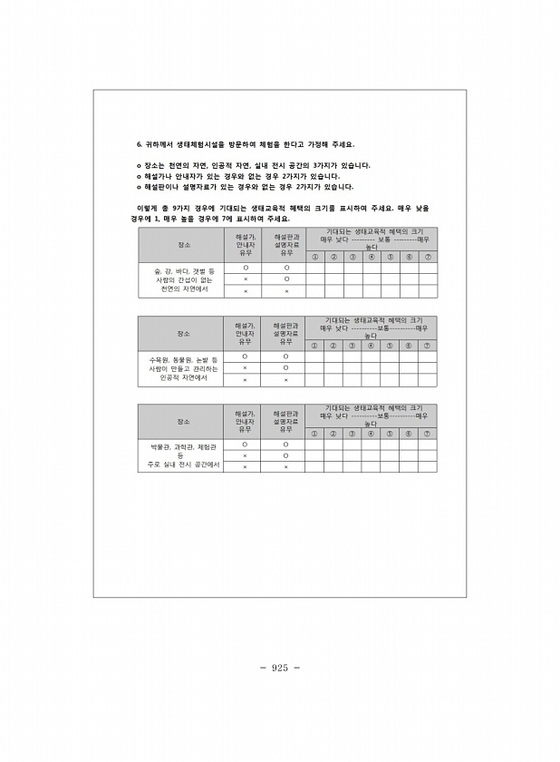 255 나 국내 선행연구 1 하천생태계의 생태교육서비스 이소은 등 2014 은 하천생태계 문화서비스 측정 연구에서 교육/과학으로 하나의 세부항목 범주 으로 설정하고, 측정목표를 담수생태계의 교육적, 과학 적 이용으로 설정한 다음, 지표후보군으로 생태학습 등의 교육시설, 프로그 램 및 이용자 수로 잡았다. 그러나 측정가능성에 대해서는 관련 자료 제한 이라고 평가하였다. 2 해양생태계의 생태교육서비스 김혜선 2017 은 해양생태계 문화서비스의 하위범주로 과학/교육/연구를 잡 고, 이를 ‘해양자원의 이용 및 활용을 통한 지적 자본의 창출’이라고 정 의한 다음, 평가수단으로 현장조사 및 교육을 제시하였다. 3 산림생태계의 생태교육서비스 신유진 등 2016 은 가리왕산을 대상지로 산림생태계 문화서비스의 하위범 주로 ...