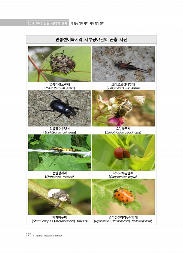2017 DMZ 일원 생태계 조사 민통선이북지역 서부평야권역 276 ? National Institute of Ecology 민통선이북지역 서부평야권역 곤충 사진 얼룩대장노린재 Placosternum esakii 고마로브집게벌레 Timomenus komarowi 외뿔장수풍뎅이 Eophileurus chinensis 호랑꽃무지 Lasiotrichius succinctus 큰밀잠자리 Orthetrum melania 사시나무잎벌레 Chrysomela populi 배자바구미 Sternuchopsis Mesalcidodes trifidus 열석점긴다리무당벌레 Hippodamia Hemisphaerica tredecimpunctat