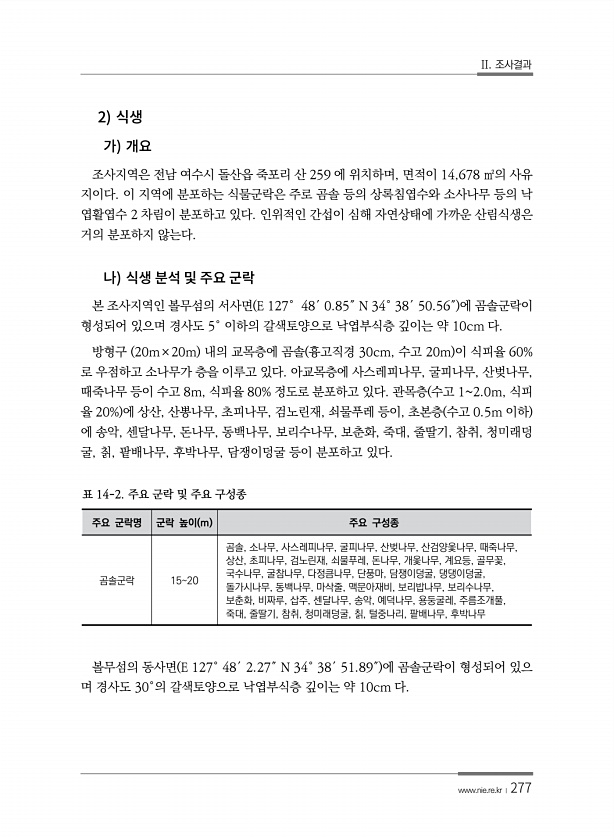 II. 조사결과 www.nie.re.kr ?277 2 조사지역은 전남 여수시 돌산읍 죽포리 산 259 에 위치하며, 면적이 14,678 ㎡의 사유 지이다. 이 지역에 분포하는 식물군락은 주로 곰솔 등의 상록침엽수와 소사나무 등의 낙 엽활엽수 2 차림이 분포하고 있다. 인위적인 간섭이 심해 자연상태에 가까운 산림식생은 거의 분포하지 않는다. 본 조사지역인 볼무섬의 서사면 E 127° 48′ 0.85″ N 34° 38′ 50.56″ 에 곰솔군락이 형성되어 있으며 경사도 5° 이하의 갈색토양으로 낙엽부식층 깊이는 약 10cm 다. 방형구 20m×20m 내의 교목층에 곰솔 흉고직경 30cm, 수고 20m 이 식피율 60% 로 우점하고 소나무가 층을 이루고 있다. 아교목층에 사스레피나무, 굴피나무, 산벚나무, 때죽나...