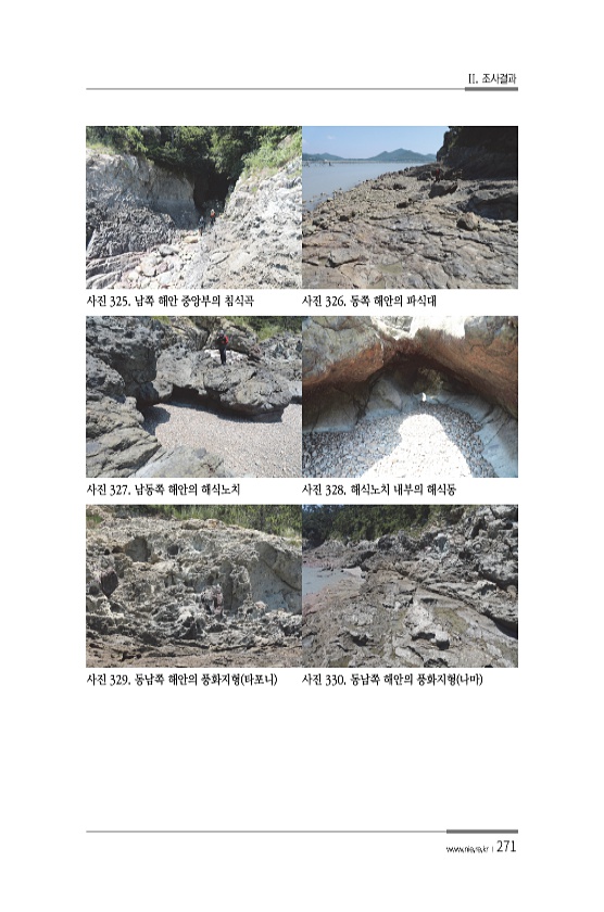 II. 조사결과 www.nie.re.kr ?271 사진 325. 남쪽 해안 중앙부의 침식곡 사진 326. 동쪽 해안의 파식대 사진 327. 남동쪽 해안의 해식노치 사진 328. 해식노치 내부의 해식동 사진 329. 동남쪽 해안의 풍화지형 타포니 사진 330. 동남쪽 해안의 풍화지형 나마