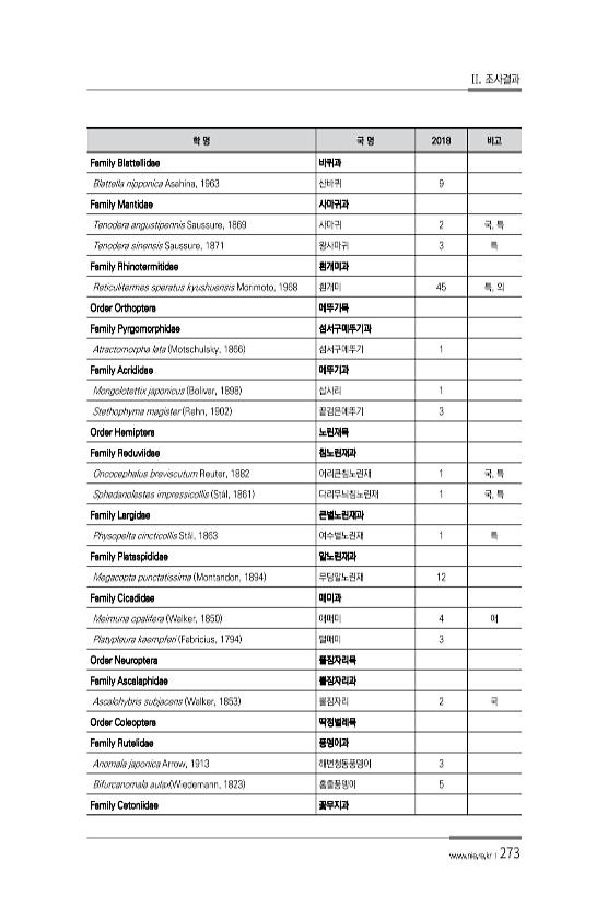 II. 조사결과 www.nie.re.kr ?273 학 명 국 명 2018 비고 Family Blattellidae 바퀴과 Blattella nipponica Asahina, 1963 산바퀴 9 Family Mantidae 사마귀과 Tenodera angustipennis Saussure, 1869 사마귀 2 국, 특 Tenodera sinensis Saussure, 1871 왕사마귀 3 특 Family Rhinotermitidae 흰개미과 Reticulitermes speratus kyushuensis Morimoto, 1968 흰개미 45 특, 외 Order Orthoptera 메뚜기목 Family Pyrgomorphidae 섬서구메뚜기과 Atractomorpha lata Motschulsky, 1866 ...