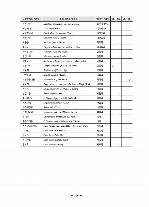 259 Common name Scientific name Family name ES RS CS NP 쥐똥나무 Ligustrum obtusifolium Siebold & Zucc. 물푸레나무과 꼭두서니 Rubia akane Nakai 꼭두서니과 누리장나무 Clerodendrum trichotomum Thunb. 마편초과 작살나무 Callicarpa japonica Thunb. 마편초과 배풍등 Solanum lyratum Thunb. 가지과 파리풀 Phryma leptostachya var. asiatica H. Hara 파리풀과 가막살나무 Viburnum dilatatum Thunb. 인동과 덜꿩나무 Viburnum erosum Thunb. 인동과 딱총나무 Sambucus williamsii var. core...