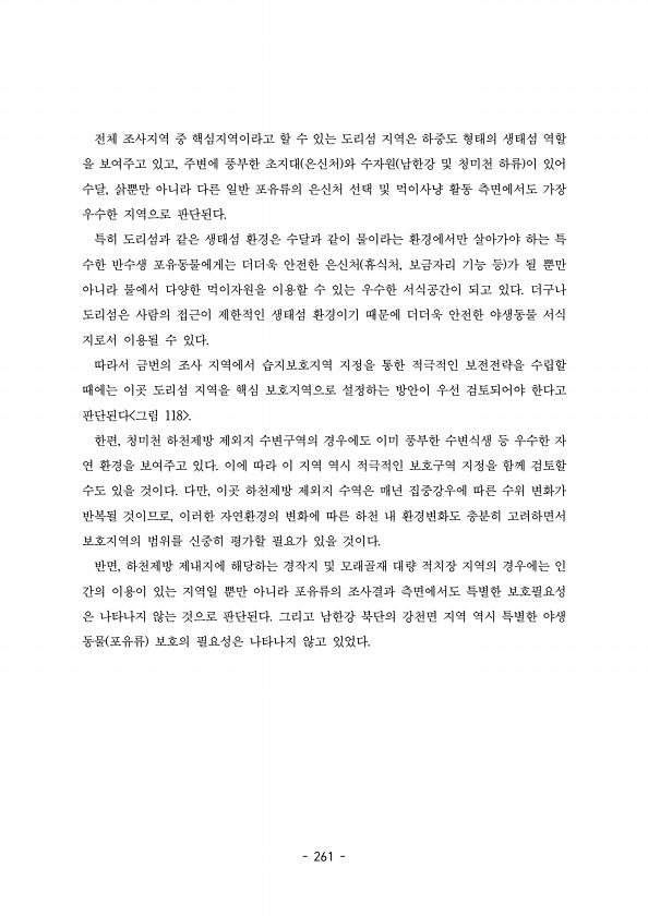 261 전체 조사지역 중 핵심지역이라고 할 수 있는 도리섬 지역은 하중도 형태의 생태섬 역할 을 보여주고 있고 주변에 풍부한 초지대 은신처 와 수자원 남한강 및 청미천 하류 이 있어 , 수달 삵뿐만 아니라 다른 일반 포유류의 은신처 선택 및 먹이사냥 활동 측면에서도 가장 , 우수한 지역으로 판단된다. 특히 도리섬과 같은 생태섬 환경은 수달과 같이 물이라는 환경에서만 살아가야 하는 특 수한 반수생 포유동물에게는 더더욱 안전한 은신처 휴식처 보금자리 기능 등 가 될 뿐만 , 아니라 물에서 다양한 먹이자원을 이용할 수 있는 우수한 서식공간이 되고 있다 더구나. 도리섬은 사람의 접근이 제한적인 생태섬 환경이기 때문에 더더욱 안전한 야생동물 서식 지로서 이용될 수 있다. 따라서 금번의 조사 지역에서 습지보호지역 지정...