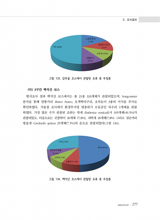Ⅱ. 조사결과 www.nie.re.kr ? 277 그림 133. 감우골 코스에서 관찰된 조류 중 우점종 다 3구간 백석산 코스 현지조사 결과 백석산 코스에서는 총 21종 333개체가 관찰되었으며, Song-meter 분석을 통해 말똥가리 Buteo buteo, 오색딱다구리, 오목눈이 3종의 서식을 추가로 확인하였다. 겨울철 조사에서 환경부지정 멸종위기 Ⅱ등급인 독수리 1개체를 관찰 하였다. 가장 많은 수가 관찰된 조류는 쑥새 Emberiza rustica로서 165개체 49.5% 가 관찰되었고, 다음으로는 곤줄박이 26개체 7.8% , 쇠박새 26개체 7.8% 그리고 검은머리 방울새 Carduelis spinus 25개체 7.5% 의 순으로 관찰되었다 그림 134 그림 134. 백석산 코스에서 관찰된 조류 ...