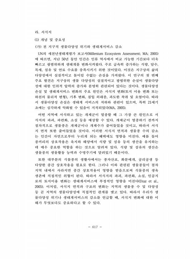 617 라. 서식지 1 개념 및 중요성 가 전 지구적 생물다양성 위기와 생태계서비스 감소 UN의 새천년생태계평가 보고서 Millenium Ecosystem Assessment; MA; 2005 에 따르면, 지난 50년 동안 인간은 인류 역사에서 비교 가능한 기간보다 더욱 빠르고 광범위하게 생태계를 변화시켜왔다. 주로 급속히 증가하는 식량, 담수, 목재, 섬유 및 연료 수요를 충족시키기 위한 것이었다. 이것은 지구상의 삶의 다양성에서 실질적이고 돌이킬 수없는 손실을 가져왔다. 이 연구의 첫 번째 주요 발견은 지구상의 생물 다양성의 실질적이고 광범위한 손실이 생물다양 성에 대한 인위적 압력의 증가와 분명히 관련되어 있다는 것이다. 생물다양성 손실 및 생태계서비스 변화의 주요 원인은 서식지 변화 토지 이용 변화 ...