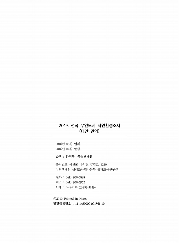 2015 전국 무인도서 자연환경조사 태안 권역 2016년 03월 인쇄 2016년 04월 발행 발행 환경부·국립생태원 충청남도 서천군 마서면 금강로 1210 국립생태원 생태조사평가본부 생태조사연구실 전화 041 950-5828 팩스 041 950-5952 인쇄 다나기획 02-859-5359 ⓒ2016 Printed in Korea 발간등록번호 11-1480000-001351-10