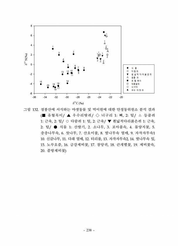 238 그림 132. 점봉산에 서식하는 야생동물 및 먹이원에 대한 안정동위원소 분석 결과 ■ 유혈목이/ ▲ 우수리땃쥐/ ◇ 너구리 1뼈, 2털/ △ 등줄쥐 1근육, 2털/ ○ 다람쥐 1털, 2근육/ ▼ 흰넓적다리붉은쥐 1근육, 2털/ ● 식물 1산딸기, 2. 소나무, 3. 포아풀속, 4. 물양지꽃, 5. 층층나무속, 6. 잣나무, 7. 산오이풀, 8. 벚나무속 열매, 9. 자작자무속1 10. 신갈나무, 11. 다래 열매, 12. 터리풀, 13. 자작자무속2, 14. 벚나무속 잎, 15. 노루오줌, 16. 금강제비꽃, 17. 참당귀, 18. 큰개별꽃, 19. 제비꽃속, 20. 졸방제비꽃