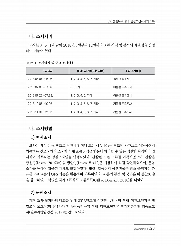iv. 동강유역 생태·경관보전지역의 조류 www.nie.re.kr ?273 조사는 표 ⅳ-1과 같이 2018년 5월부터 12월까지 조류 서식 및 분포의 계절성을 반영 하여 이루어 졌다. 조사일자 중점조사구역 또는 지점 주요 조사내용 2018.05.04.05.07. 1, 2, 3, 4, 5, 6, 7, 기타 봄철 조류조사 2018.07.07.07.08. 6, 7, 기타 여름철 조류조사 2018.07.26.07.28. 1, 2, 3, 4, 5, 기타 여름철 조류조사 2018.10.05.10.08. 1, 2, 3, 4, 5, 6, 7, 기타 가을철 조류조사 2018.11.30.12.02. 1, 2, 3, 4, 5, 6, 7, 기타 겨울철 조류조사 표 iv-1. 조사일정 및 주요 조사내용 1 조사는 시속 2km 정...