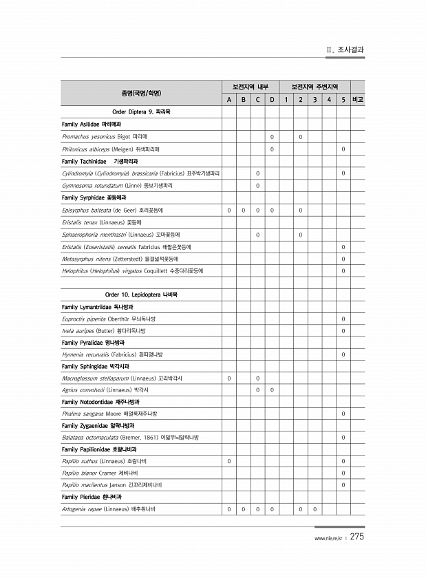 Ⅱ. 조사결과 www.nie.re.kr ? 275 종명 국명/학명 보전지역 내부 보전지역 주변지역 A B C D 1 2 3 4 5 비고 Order Diptera 9. 파리목 Family Asilidae 파리매과 Promachus yesonicus Bigot 파리매 0 0 Philonicus albiceps Meigen 쥐색파리매 0 0 Family Tachinidae 기생파리과 Cylindromyia Cylindromyia brassicaria Fabricius 표주박기생파리 0 0 Gymnosoma rotundatum Linn? 뚱보기생파리 0 Family Syrphidae 꽃등에과 Episyrphus balteata de Geer 호리꽃등에 0 0 0 0 0 Eristalis tenax Linnaeus ...