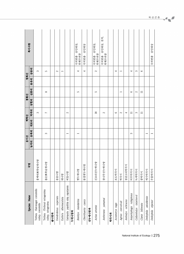 육 상 곤 충 National Institute of EcologyⅠ275 Species Name 국명 웅이산 백학산 봉황산 청화산 특이사항 능치리 웅북리 대포리 덕곡리 상현리 심봉리 용유리 삼송리 Tethea Saronaga consimilis subsp. consimilis 홍백띠뾰족날개나방 3 3 Tethea Tethea octogesima subsp. octogesima 좁은뾰족날개나방 3 7 8 5 솔나방과 Dendrolimus superans 솔송나방 2 Euthrix albomaculata 대나방 1 Gastropacha populifolia subsp. angustipennis 버들나방 1 2 누에나방과 Bombyx mandarina 멧누에나방 1 5 4 국외반출 승인대상, 위해우려종 Ober...