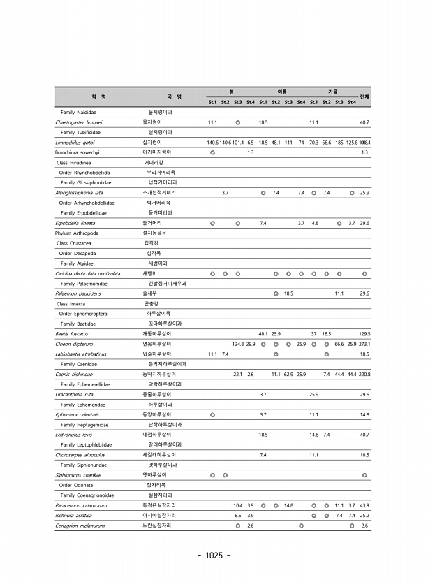 1025 학 명 국 명 봄 여름 가을 전체 St.1 St.2 St.3 St.4 St.1 St.2 St.3 St.4 St.1 St.2 St.3 St.4 Family Naididae 물지렁이과 Chaetogaster limnaei 물지렁이 11.1 ◎ 18.5 11.1 40.7 Family Tubificidae 실지렁이과 Limnodrilus gotoi 실지렁이 140.6 140.6 101.4 6.5 18.5 48.1 111 74 70.3 66.6 185 125.8 1088.4 Branchiura sowerbyi 아가미지렁이 ◎ 1.3 1.3 Class Hirudinea 거머리강 Order Rhynchobdellida 부리거머리목 Family Glossiphoniidae 넙적거머리과 Alboglossiphoni...