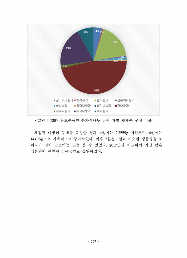 257 그림Ⅲ-120 완도수목원 붉가시나무 군락 과별 개체수 구성 비율 채집된 나방의 무게를 측정한 결과, 4월에는 2.3559g 이었으며, 6월에는 14.615g으로 지속적으로 증가하였다. 이후 7월은 6월과 비슷한 생물량을 보 이다가 점차 감소하는 것을 볼 수 있었다. 2017년과 비교하면 가장 많은 생물량이 관찰된 것은 6월로동일하였다.