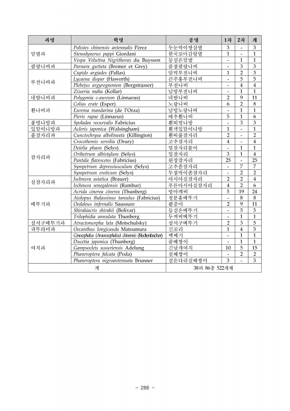 278 ? National Institute of Ecology 학명 국명 도창리 성재산 대성산 적근산 산양리 주파리 고둔골 비운이 비고 Libelloides sibiricus subsp. sibiricus 노랑뿔잠자리 1 1 국외반출 승인대상, 유용곤충_천적, 적색목록 관심대상 LC , 해충 Hemithea tritonaria 녹색푸른자나방 2 적색목록 미평가 NE Macaria liturata 다색띠큰가지나방 2 분포특이종_고산성, 분포특이종_남부, 분포특이종_사구, 분포특이종_습지, 분포특이종_중북이북, 위해우려가능종, 유용곤충_천적, 유용곤충_화분매개, 유용곤충_환경정화, 적색목록 미평가 NE , 해충 Japananus aceri 단풍뾰족매미충 1 1 Niphanda fusca 담흑부전나비 2 적색목...